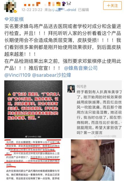 在2018年時,鄧紫棋替一家微商的臉部產品進行代言,然而卻有網友使用後造成皮膚受損,而粉絲們也開始和公司抗議,要求終止此代言。粉絲們也將矛頭指向鄧紫棋的經紀公司,認為他們擅自替鄧紫棋接下代言,卻不經過查證,嚴重損害了鄧紫棋的名聲。