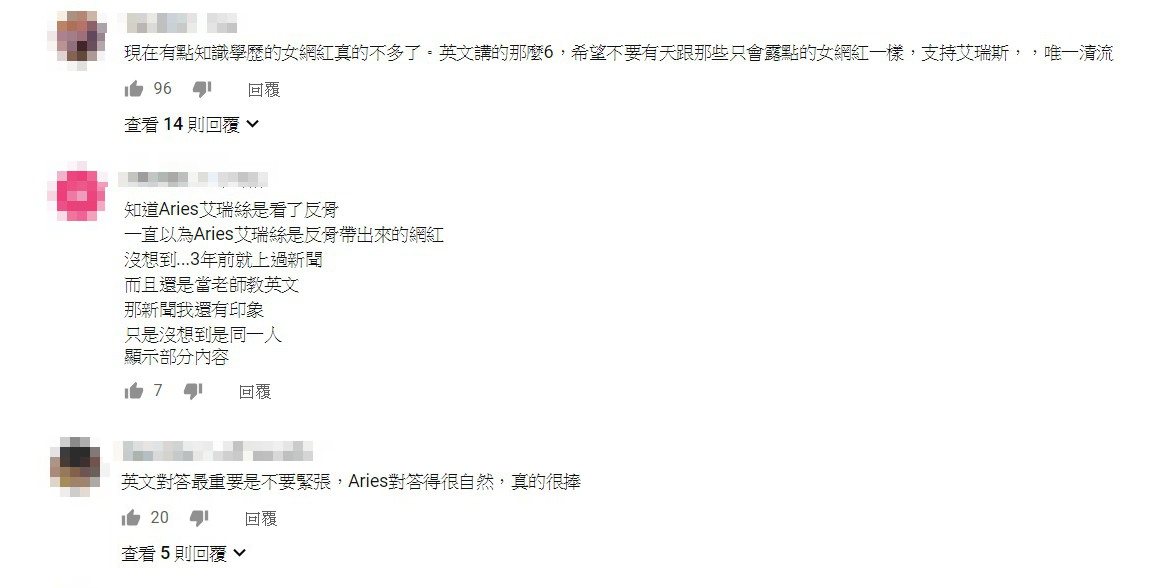 影片一出,許多網友大讚艾瑞絲的英文實力:「現在有點知識學歷的女網紅真的不多了,英文講得那麼6,希望不要有天跟那些只會露點的女網紅一樣,支持艾瑞絲,唯一清流」、更有人起底她:「知道艾瑞絲是看了反骨,一直以為艾瑞絲是反骨帶出來的網紅,沒想到...3年前就上過新聞,而且還是當老師教英文,那新聞我還有印象,只是沒想到是同一人」、「英文對答最重要是不要緊張,艾瑞絲對答得很自然,真的很棒」。