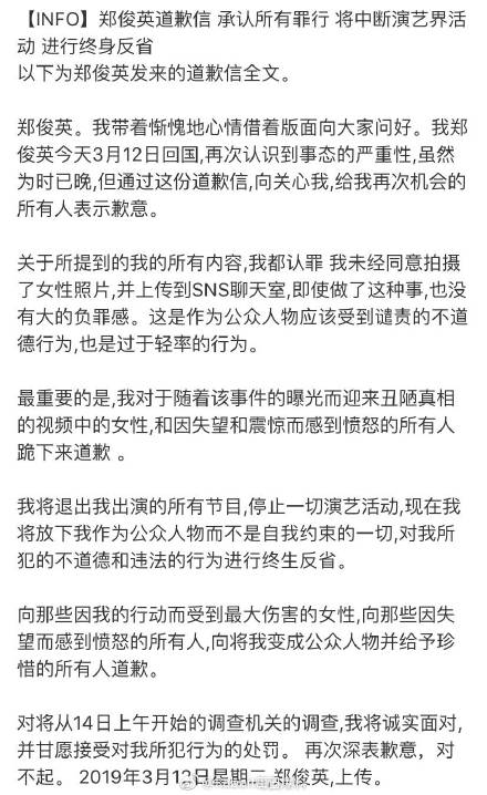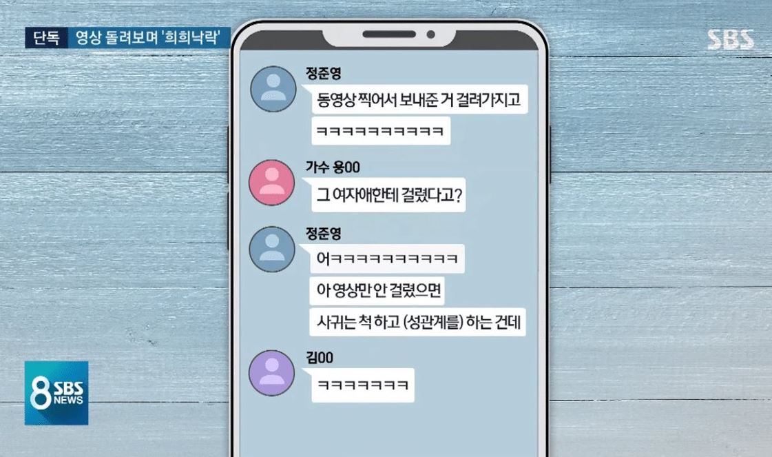韓國電視台SBS指出,30歲男歌手鄭俊英手握偷拍影片,12日,鄭俊英被緊急召回韓國,同時也承認犯罪事實並積極受審,他說到「未經同意偷拍女性更散步到聊天室中,而且沒有任何罪惡感的做了這些事,我願意為此受罰」,而鄭俊英好友包括少女時代成員俞利哥哥權俊赫、FTISLAND崔鍾訓和CNBLUE李宗泫,都無辜被指為群聊成員之一。