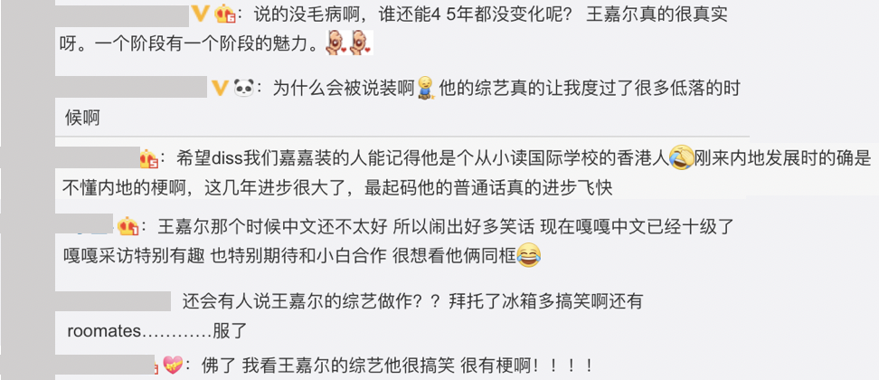 而粉絲們看見王嘉爾被質疑上節目是故意裝萌,也紛紛留言替他打抱不平:「誰還能4、5年都沒變化呢? 王嘉爾真的很真實呀,一個階段有一個階段的魅力」、「為什麼會被說裝啊,他的綜藝真的讓我度過了很多低落的時候啊」、「希望diss我們嘉嘉裝的人能記得他是個從小讀國際學校的香港人,剛來內地發展時的確是不懂內地的梗啊,這幾年進步很大了」