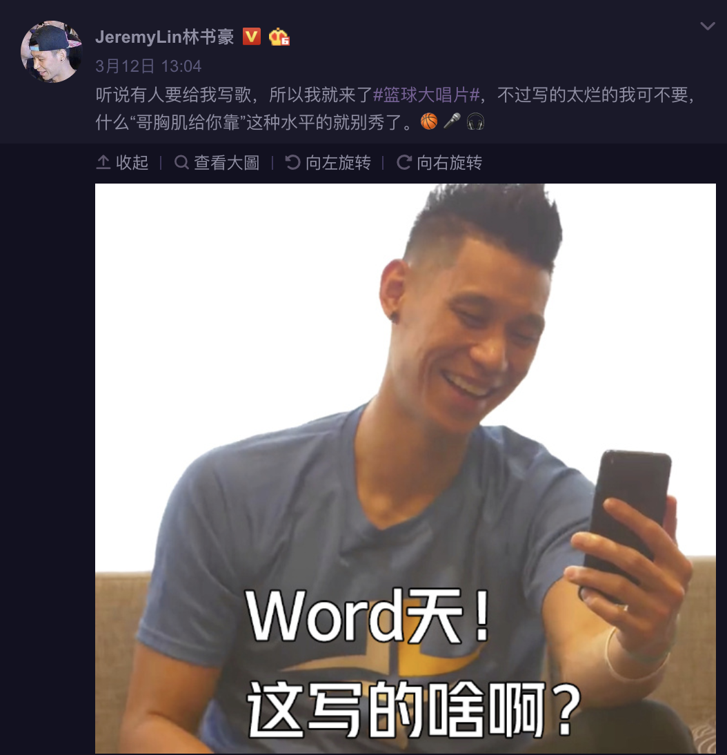 NBA球星「林書豪」在2012時他代表尼克出戰暴龍,在總決賽終場前0.5秒投進致勝三分球,掀起一股「林來瘋」的熱潮,之後也紛紛轉戰其他隊伍,在二月時正式與多倫多暴龍簽約。然而林書豪和周杰倫擁有相當好的交情,兩人時常在社群平台上搞笑互嗆,近日林書豪也發微博調侃周杰倫的創作,引發網友熱議。