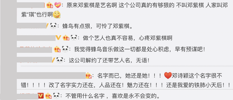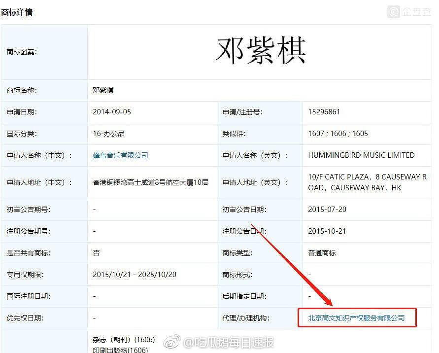 鄧紫棋宣布和蜂鳥音樂解約之後,粉絲們相當擔心她未來的演藝之路是否會受到阻撓,在網友提供的圖片中可以看見蜂鳥音樂有限公司在2014年9月5日申請了「鄧紫棋」的商標,讓粉絲相當擔心未來還能不能夠使用鄧紫棋這個名字,抑或是要更改成她的本名「鄧詩穎」。網友見狀後也紛紛留言:「原來鄧紫棋是藝名啊 這個公司真的有夠狠的」、「蜂鳥有點狠,可憐了鄧紫棋」、「做個藝人也真不容易,心疼鄧紫棋啊」,也有網友認為即便要更改藝名,也不會影響到粉絲們對她的愛。