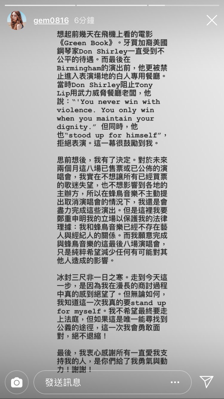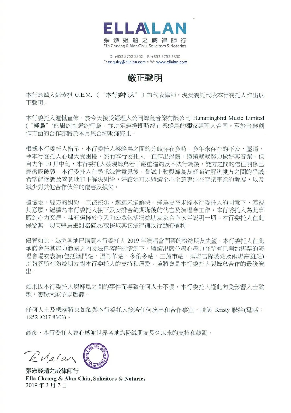 鄧紫棋在7日晚間痛心寫下:「這些年來我一次次在不公平的狀況裡嘗試調整自己的心態;一次次擦掉眼淚告訴自己息事寧人...」,並提到公司一再的漠視事情的嚴重性,天后「鄧紫棋」去年演藝事業相當豐收,名聲響遍國內外,而鄧紫棋也將在今年4月時前進南台灣開唱,如今卻發出公告宣布「和蜂鳥音樂正式解約」,最後鄧紫棋也提到:「我在漫長的商討過程中真的感到絕望了」,語氣傳遞出滿滿的無奈與沉痛。