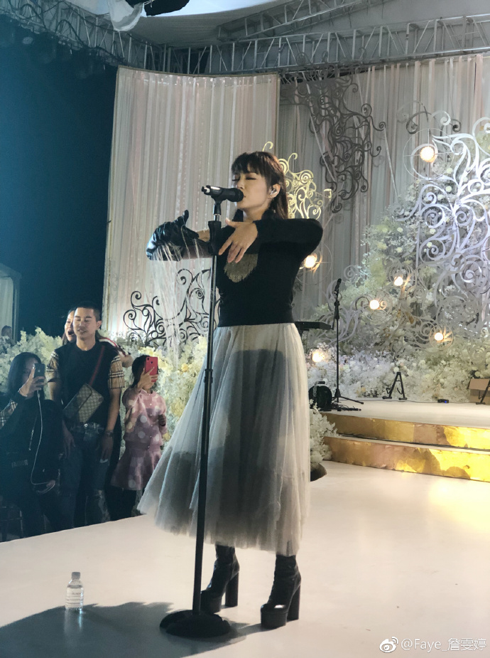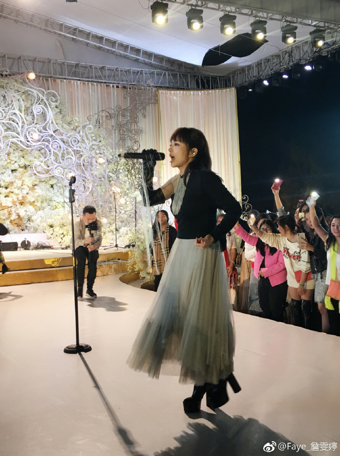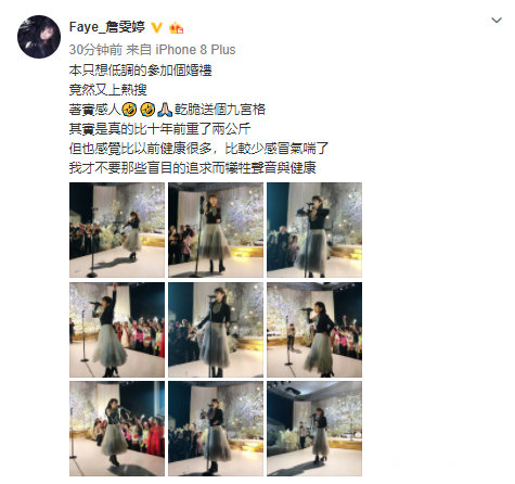 身穿黑色薄紗裙的飛在婚禮舞台上飆唱,邊唱還邊揮舞著雙手,相當投入,但在鏡頭的拍攝下,她的手臂也粗壯不少,臉蛋更是整個變圓,模樣跟過往差很大,不少網友們看到後驚呆,認為飛「發福了」!得知消息的飛立刻在微博上發布訊息寫著:「本只想低調的參加個婚禮,竟然又上熱搜,著實感人」,也坦言:「其實是真的比十年前重了兩公斤」,最後更喊話歌迷:「我才不要那些盲目的追求而犧牲聲音與健康」,如此正面言論獲得網友們狂讚。