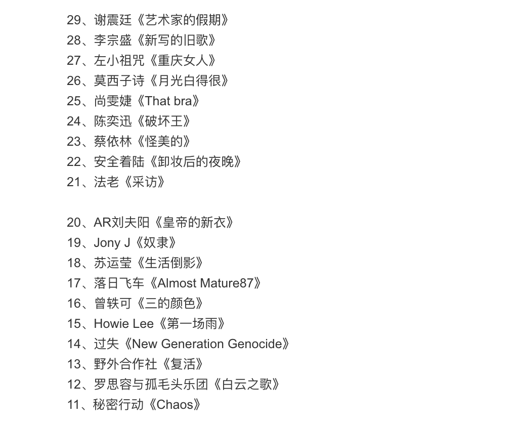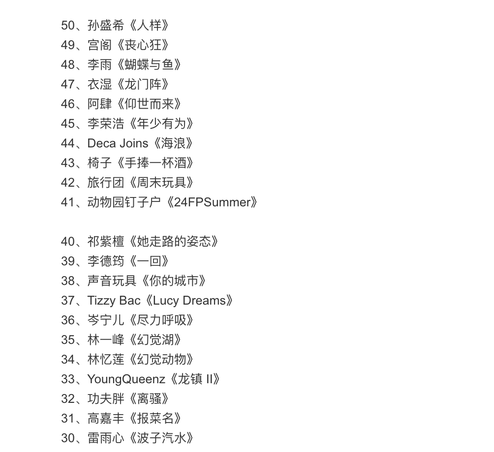 在第50名到第11名之中,有許多來自台灣的歌手們,第50名是孫盛希的《人樣》,這首歌由知名音樂人HUSH作詞,搖滾的曲風再搭配上孫盛希特有的唱腔,榮獲第50名的佳績;第29名則是來自謝震廷的《藝術家的假期》,謝震廷自節目《超級星光大道》出道後,開始走向創作之路,這首歌也是由他一人包辦詞曲;第23名則是天后蔡依林的《怪美的》,這首歌唱出刻板價值觀對蔡依林的枷鎖,而她也相當勇敢的做自己。