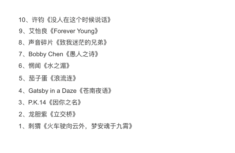 而在前10名的排行中,耳帝皆會寫下他個人的分析與點評,像是第9名是金曲歌后艾怡良的《Forever Young》,耳帝也寫下:「這是給生命活出自由與力量的信條,在死去與活著之間,流淌著蜿蜒曲折的生命之河,就像這旋律一樣深情、低回而雋永,彷彿有著永無盡頭的流動」,而獲得金曲獎「最佳新人」與「最佳台語專輯」的樂團茄子蛋也榜上有名,他們憑藉《浪流連》獲得了第5名的佳績。