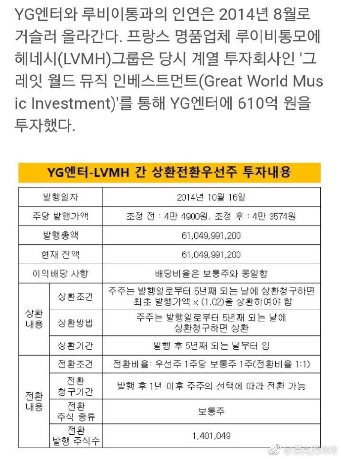 此外,YG投資額者還包括媒體NAVER、法國集團LVMH旗下新加坡公司、大陸騰訊和微影時代,根據韓國論壇「Instiz」指出,由於YG股價連年下跌,新加坡公司早就決定今年10月會向YG要求償還本息670億韓元。