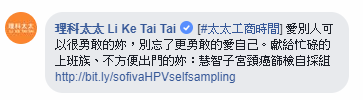 理科太太為了因應婦女節,於7日分享了影片《現在只要1分鐘 - 在家做完子宮頸癌篩檢》,影片中她先是介紹了子宮頸癌,接著開始介紹在家自行篩檢的產品及使用辦法,對此立委陳宜民強調「那是篩檢人類乳突病毒、不是篩檢子宮頸癌」,更表示這支影片未經申請便宣傳醫療產品已經違法,衛福部長陳時中也表示坊間的自行篩檢無法取代真正的子宮頸癌篩檢。