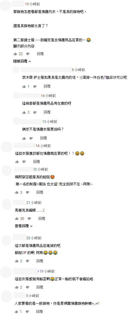 瑀熙接著換上了前三名的空姐、女僕、水手服,青春洋溢的模樣也讓許多粉絲看了相當動心,不過因為前兩套尺度太大,仍引起許多討論。許多網友紛紛留言:「人家要看的是一般旗袍,你是買裸露情X旗袍幹嘛」、「妳自己都買情X裝 制式觀光列車服不一樣」、「那旗袍怎麼看都是情趣內衣,不是真的旗袍吧。第二套護士服⋯⋯我確定是去情趣用品店買的。」。