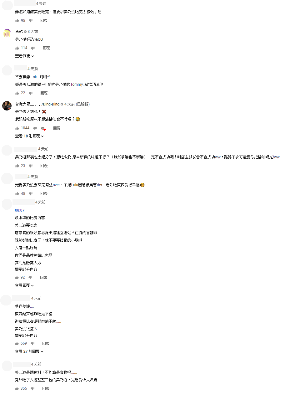 粉絲看見之後,則紛紛留言:「要求美乃滋吃完太誇張了吧...」、「美乃滋那裏也太過分了,想吃食物 原本新鮮的味道不行?」、「沒水準的比賽內容 店家真的很好意思提出這種立場站不住腳的言辭耶」、「爭鮮差評....辦這種比賽還那麼輸不起.....」、「竟然吃了大概整整三包的美乃滋,光想就令人反胃」。