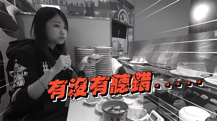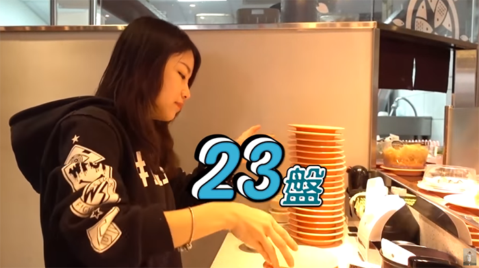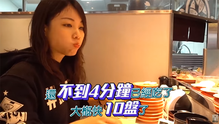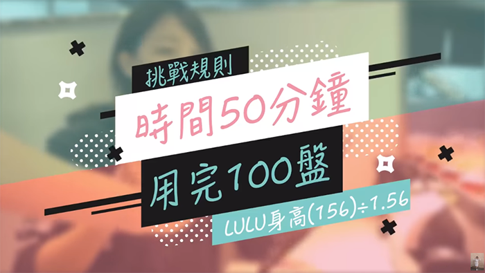 這次的挑戰中,身高156公分的路路必須在50分鐘內吃完100盤的壽司,她也在剛開始挑戰4分鐘之後便成功吃了10盤,10分時更已吃了23盤,速度驚人,讓一旁拍攝的攝影師相當看好她。
