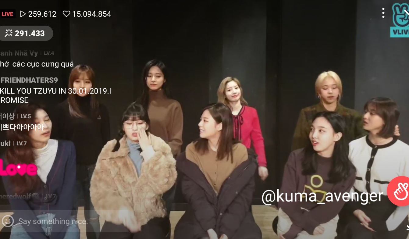 同樣的死亡威脅也曾發生在成員子瑜身上,1月17日,TWICE透過VLive和粉絲互動,短短16分鐘的互動看似相當開心,卻在影片快尾聲時,有名網友竟威脅周子瑜並說到「我保證會在1月30日殺了子瑜」。消息一出震驚外界,大批網友也在Twitter上轉貼「直播截圖」,並標記經紀公司把關成員的人身安全。