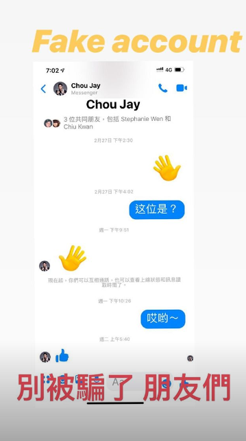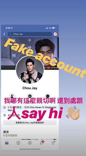 對此,周杰倫也特地發文澄清,提醒粉絲那是「fake account(假帳號)」,還要大家小心別被騙了。只不過之後疑似又有其他網友收到對方的私訊,因此他又再度發文自嘲:「我哪有那麼親切啊,還到處跟人say hi!」完全展現了他的幽默個性。