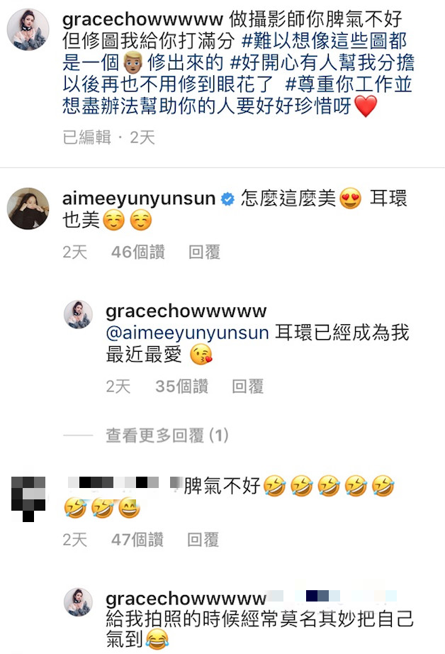 不過周揚青卻透露,攝影師「脾氣不好」,常常為了幫她拍照生氣,但她下一秒卻又稱讚對方「但修圖我給你打滿分!」原來,這些圖全是「掌鏡者」一手後製、調光出來的,讓她難以置信地說:「難以想像這些圖都是一個男人修出來的!好開心有人幫我分擔,以後再也不用修到眼花了。尊重你工作並想盡辦法幫助你的人,要好好珍惜呀❤️」