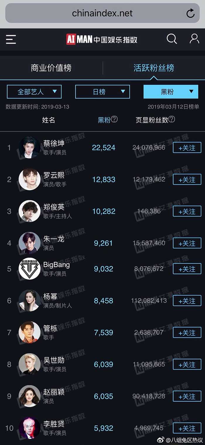 根據此數據公布的結果顯示,黑粉最多的明星排名第10名到第6名分別為:李勝賢、趙麗穎、吳世勳、管櫟、楊冪,前5名如下: