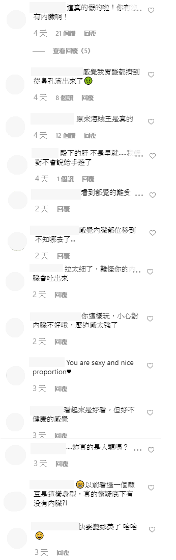 粉絲看見之後,則紛紛留言:「這真的假的啦!你有沒有內臟啊!」、「原來海賊王是真的」、「感覺我胃酸都擠到從鼻孔流出來了」、「太誇張了吧!那個腰」、「感覺內臟都位移到不知哪去了...」、「你這樣玩,小心對內臟不好哦,壓迫感太強了」、「....妳真的是人類嗎」。