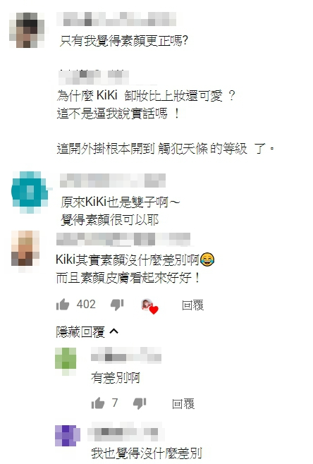 看完KiKi的素顏後,網友們都稱讚說:「只有我覺得素顏更正嗎?」、「為什麼KiKi卸妝比上妝還可愛?這不是逼我說實話嗎!這開外掛根本開到 觸犯天條的等級了」、「覺得素顏很可耶」、也有人覺得:「其實素顏梅什麼差別啊而且素顏皮膚看起來好好!」、「我也覺得沒什麼差別」。