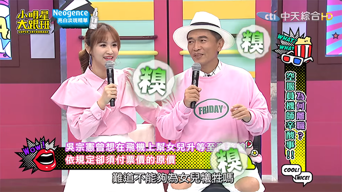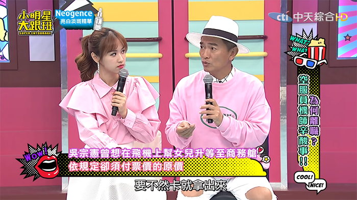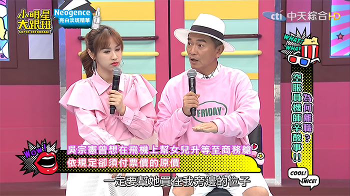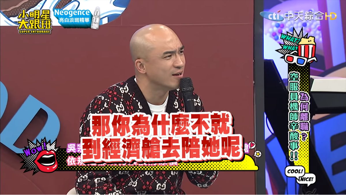不過來賓小馬就質疑:「那你為什麼就不能到經濟艙去陪她呢?」、「一個做爸爸的難道不能夠為女兒犧牲嗎?」這一講吳宗憲臉瞬間垮了,Sandy也在旁邊補了一槍:「他不願意!」吳宗憲趕緊解釋,他到後面一看位置都是滿的,且他飛行的時數並不比空姐少,認為法律道理之外不外乎是人情,「照理講要通融一下,對不對!」