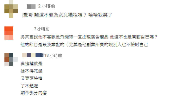 不過有部分網友並不這麼認為,覺得沒有花錢買商務艙,憑甚麼要空姐通融:「吳這種就是,捨不得花錢又要耍特權,了不起喔」、「吳宗憲整集都在…放⋯…X屁!」