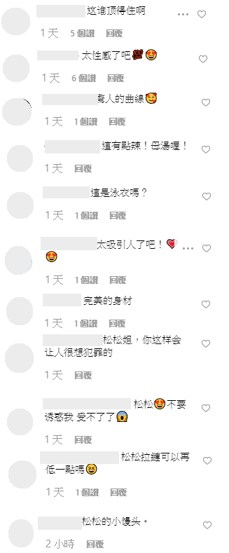 照片上傳之後,許多網友紛紛留言:「太性感了吧」、「這誰頂得住啊」、「驚人的曲線」、「太吸引人了吧!」、「完美的身材」、「好喜歡松松」、「You are so sexy」、「松松拉鏈可以再低一點嗎」、「身材真的好棒」、「這有點辣!母湯」、「你這樣會讓人很想犯罪的」。