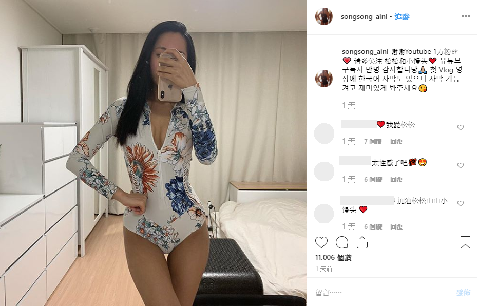 松松16日在自己的IG「songsong_aini」中分享照片,只見照片中她維持一貫的拍照習慣,用手機遮住了自己的臉,不過亮點卻在她的胸前!原來這次松松罕見展露好身材,將緊身泳衣的拉鍊微微拉下,露出W型的性感雙峰,就連下半身的蜜大腿也相當吸睛!