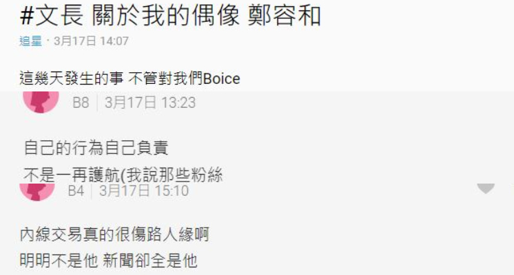 其中台灣論壇「dcard」網友則一面倒認為鄭容和為李宗泫背鍋十分無辜,甚至挖出2016年「炒股事件」聲援鄭容和。2016年7月16日FNC娛樂對外宣布「簽約劉在錫」讓公司股票上漲,而鄭容和則因購入公司股票而被扣上「炒股」嫌疑,事後公司澄清「鄭容和並不知道劉在錫簽約」,另一成員李宗泫則是知情簽約一事,不過在買入股票後發現可能違法而收手。