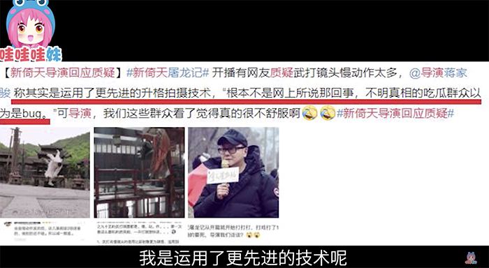 金庸的小說被公認是最適合改編成電視劇的武俠小說,因為金庸大師寫的相當詳細且非常有畫面感,然而新版的電視劇卻不斷被網友質疑拍攝的技術,導演甚至出面回應:「我是運用了更先進的技術」,和網友們引發辯論。