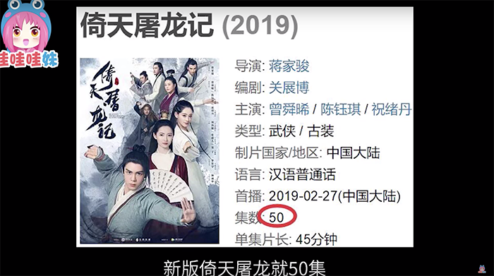 該YouTuber在影片中指出,新版《倚天屠龍記》的劇情太過拖戲,動作戲太長太過無趣,即便是滅絕師太和天鷹教打鬥的畫面也相當枯燥,甚至還拍出謝遜的回憶等畫面,她認為這些可以簡單帶過即可。