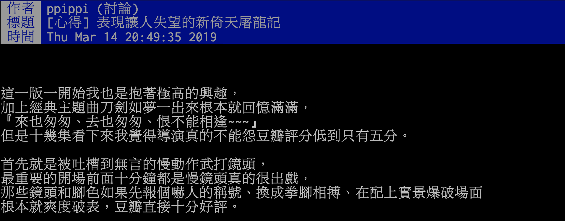 新版《倚天屠龍記》在大陸豆瓣上僅僅只有5.4的評分,而近期在PTT上也引發鄉民一陣熱議,該名網友發文寫下:「首先就是被吐槽到無言的慢動作武打鏡頭,最重要的開場前面十分鐘都是慢鏡頭真的很出戲」、「原著裡面明明白衣客一現身就順便帶出對方是長白三禽的名號,結果在這邊只是幾個雜魚在搶刀...那一瞬間我心中就暗暗的覺得不妙」,對於新版的《倚天屠龍記》感到相當失望。