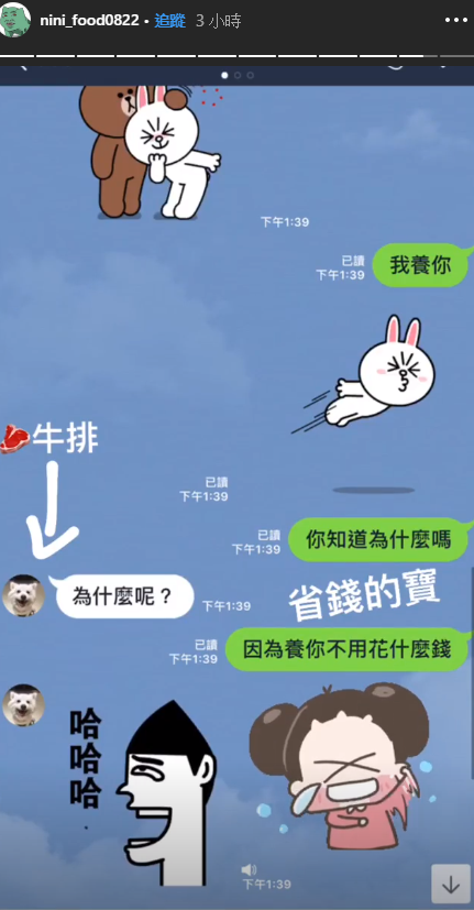 今(18)日妮妮在IG中放上和牛排的對話截圖,則引起許多粉絲關注!只見對話截圖中,妮妮和牛排告白:「我養你」,更詢問:「你知道為什麼嗎?」,牛排配合詢問:「為什麼呢?」之後,妮妮則搞笑回答:「因為養你不用花什麼錢」,使得牛排立刻哈哈大笑。