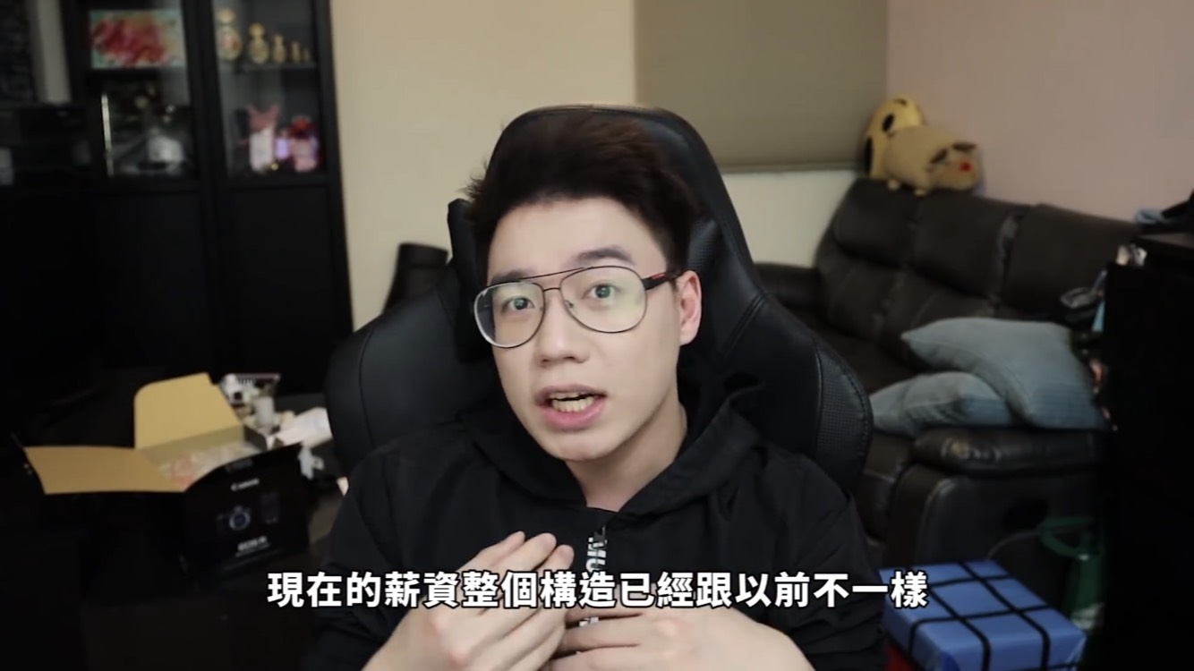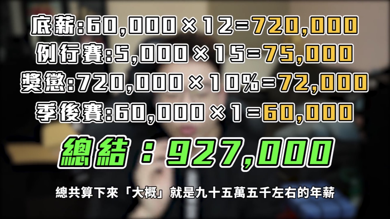 他把電競選手的收入來源分為四類,包刮:底薪、獎金、績效獎金、代言&直播收益,電競選手也有分為3~4T字的級別,最初階的1T,就是所謂的練習生,剛入門的底薪差不多為2~3萬台幣,2線選手會到4~8萬,1線選手就跳到8萬至10萬。不過他也說:「現在薪資構造不一樣,也較不透明化」,現在官方也新增許多,但他也搞笑表示:「反正現在也拿不到」。
