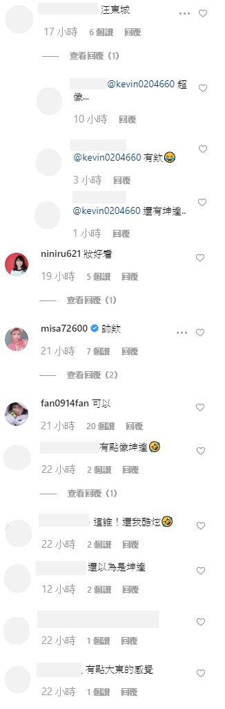 照片上傳之後,立刻引起許多討論:「汪東城」、「妝好看」、「歐巴的感覺」、「真的帥到差點退追蹤」、「有點像坤達」、「這誰!還我酷炫」、「乍看好像連晨翔」,「有點大東的感覺」、「你以後還是不要戴眼鏡好了」,被粉絲認為撞臉多位帥氣男明星!