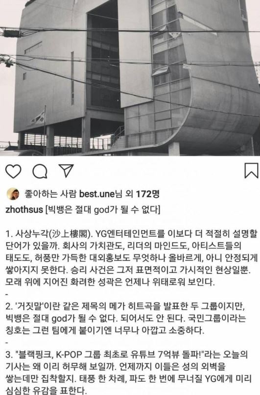 韓國娛樂公司YG娛樂旗下男團BIGBANG前成員勝利,因持股夜店一個半月以來連續爆發醜聞,勝利也因涉嫌性交易宣告退出演藝圈,重創YG娛樂形象,對此日前,JYP娛樂工作人員發布IG全文,看衰YG公司營運和旗下藝人包括BLACKPINK和BIGBANG,被YG娛樂前導演截圖分享,引起兩派網友論戰。
