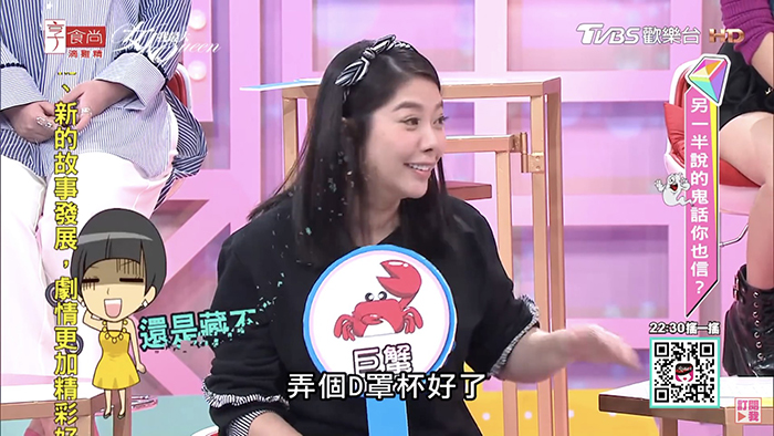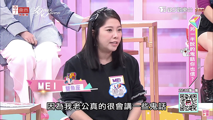 Mei在節目《女人我最大》中抱怨老公「阿弟」平時愛講鬼話,她不經意發現老公手機裡存了很多辣妹清涼照,而且都是大胸部的,好奇問對方是不是喜歡身材很豐腴的大奶妹,老公卻都否認說:「我又不是視覺的,我靠感覺,我喜歡你就是喜歡你的個性。」而她當初因為懷孕要哺乳,除了身材變胖,胸部也大了很多,發現老公看自己的眼神完全不一樣,「自從胸部變大了之後,他就沒有正眼瞧過我的臉!」還表示看自己的時候「眼神都是在看胸部」。