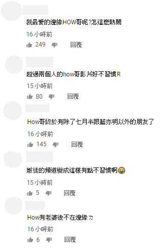 不過有趣的是,因為這是HowHow頻道的影片中,少數超過兩個人拍攝的,也讓許多網友驚訝留言:「來不及習慣,還以為進錯了頻道」、「我最愛的邊緣HOW哥呢?怎這麼熱鬧」、「超過兩個人的how哥影片好不習慣R」、「How哥終於有除了七月半跟藍亦明以外的朋友了」。