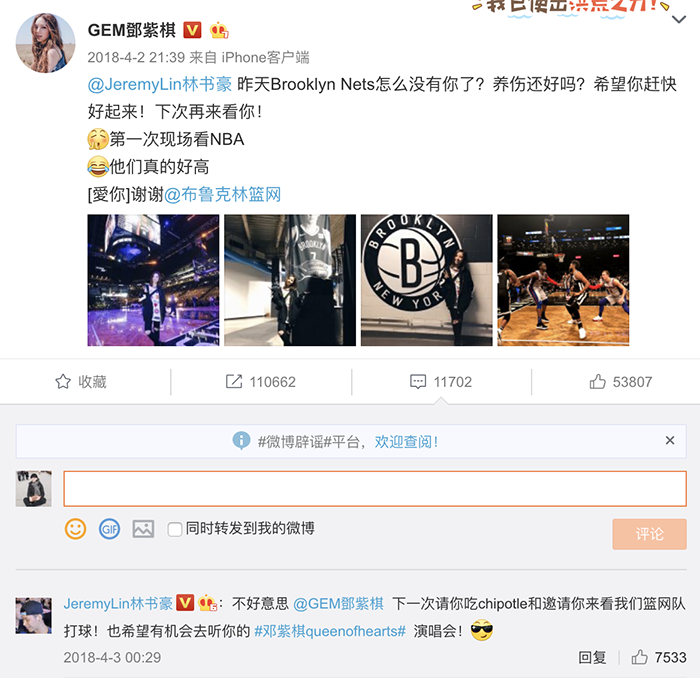 過去鄧紫棋和林書豪在網路上就曾有頻繁的互動,去年4月林書豪還在籃網隊時,鄧紫棋就曾到場觀看球賽支持,並發文寫下:「林書豪昨天布魯克林籃網隊怎麼沒有你了?養傷還好嗎?希望你趕快好起來!下次再來看你!第一次現場看NBA ,他們真的好高。謝謝布魯克林籃網」,不久後林書豪也回應:「不好意思,下一次請你吃chipotle和邀請你來看我們籃球隊打球!也希望有機會去聽你的演唱會!」,大方的在社群平台上互動,看得出兩人交情相當的好。