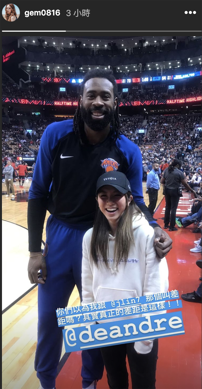 目前人在加拿大的鄧紫棋在今日也抵達NBA暴龍隊的主場觀看球賽,更發出和林書豪的合照,並寫下:「網友初次見面!然後晚上見證了厲害的網友成為隊裏最高分!厲害到爆」,隨後鄧紫棋更在限時動態中發出和暴龍隊球員「DeAndre Jordan」的合照,兩人身高相差的大約50公分,照片中鄧紫棋的頭約在球員的胸下,顯得特別嬌小,兩人也笑得非常開心。