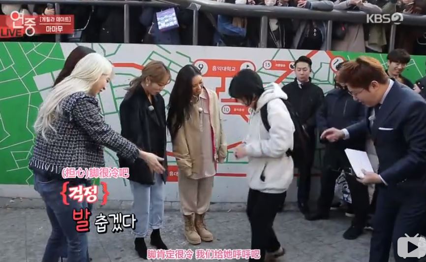 近期正進入宣傳期的MAMAMOO,15日現身綜藝節目《演藝家中介》,現身首爾街頭的他們瞬間吸引不少路人圍觀,甚至演出此次主打歌《GOGOBEBE》,節目更貼心安排粉絲互動橋段。其中一名女粉看到成員就瘋狂尖叫,讓MAMAMOO成員一時之間無法反應,不過隨即被玟星發現,女粉大冷天竟穿著拖鞋上街,這時成員二話不說全都蹲下替粉絲「吹氣」取暖,該名女粉也受寵若驚頻頻後退,最後直呼「我今天不洗腳了」。