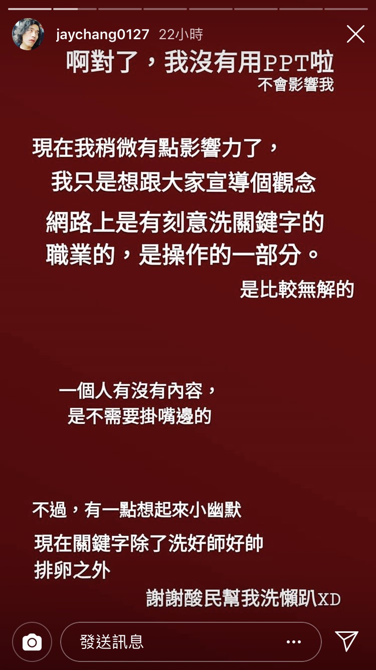 除此之外,阿傑也和大家宣導「網路上是有刻意洗關鍵字的職業的,是操作的一部份,是比較無解的」,針對大家的質疑,他則表示:「一個人有沒有內容,是不需要掛在嘴邊的」!最後也搞笑表示現在跟自己有關的關鍵字,除了「好師」、「好帥」、「排卵」之外,也多了「懶X」,讓他覺得很幽默。
