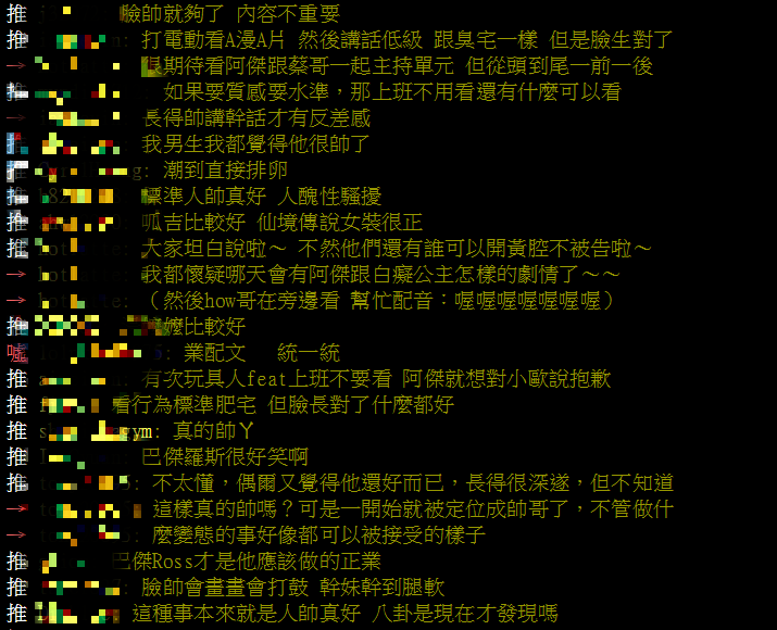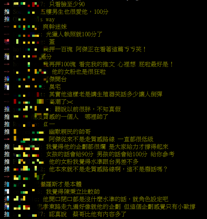 近日PTT八卦版出現文章「阿傑在女生眼裡有幾分?」,原PO表示阿傑模樣帥氣,不過其實是個宅男,平時還會開黃腔,想知道廣大鄉民會怎麼評價,而這篇文章立刻引起了正反兩方論戰,有許多粉絲大讚「只看臉至少90」、「滿分」、「幽默親民的帥哥」、「女孩的話會給90分 男孩的話會給100分」、「潮到直接排卵」、「我男生我都覺得他很帥了」!