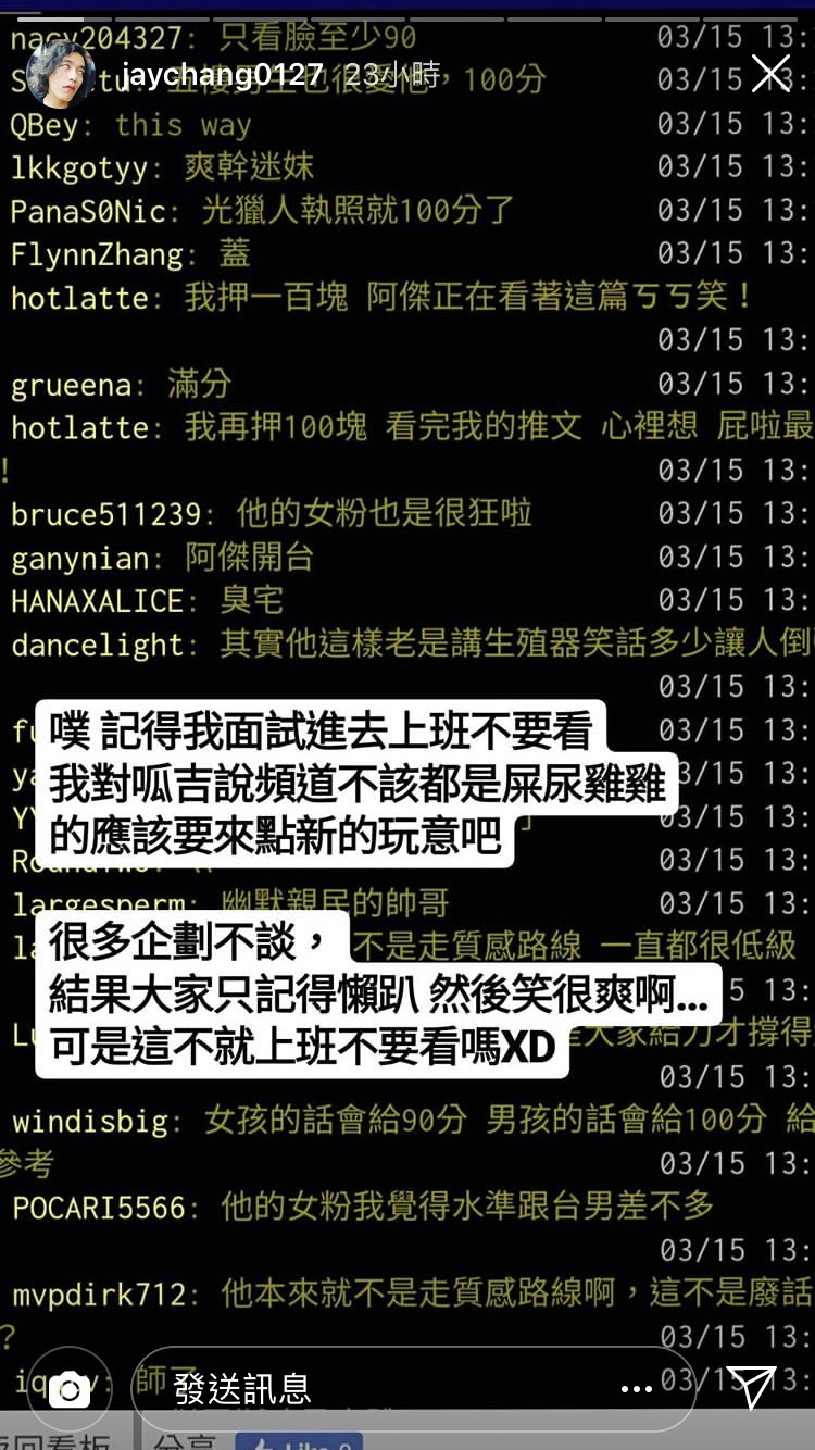而這篇文章發布後,昨(19)日阿傑則在自己IG截圖回應,阿傑表示當初面試「上班不要看」時,便對著老闆呱吉說道「頻道不該都是屎尿XX的,應該要來點新玩意吧」,而現在大家的討論「很多企劃不談,結果大家只記得XX,然後笑很爽啊,這不就上班不要看嗎?」