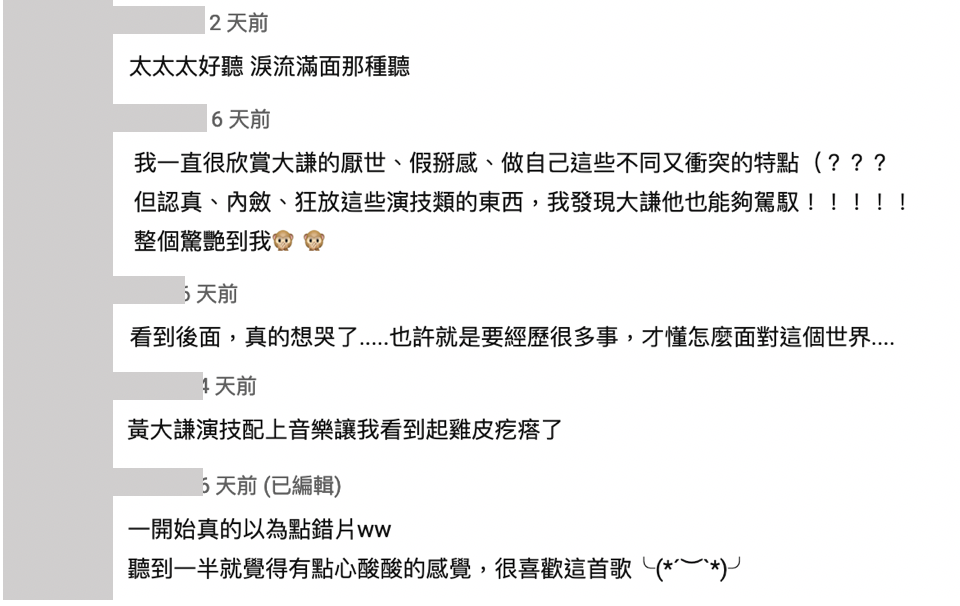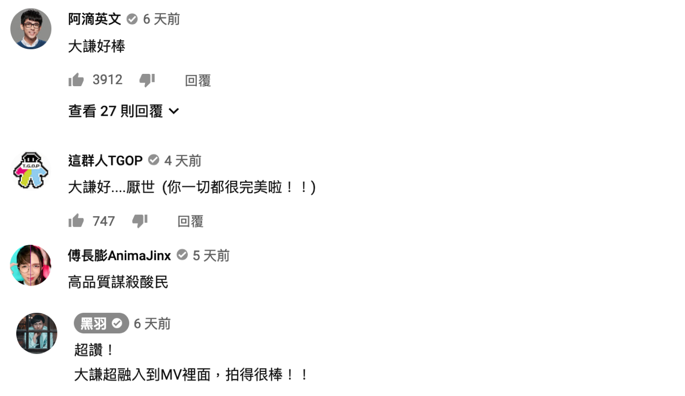 許多YouTuber也都在下方留言讚賞這次的合作,說道:「大謙好棒」、「大謙好....厭世 (你一切都很完美啦!!)」、「超讚!大謙超融入到MV裡面,拍得很棒!!」,而網友們也對這次的合作讚譽有加:「一開始真的以為點錯片,聽到一半就覺得有點心酸酸的感覺,很喜歡這首歌」、「黃大謙演技配上音樂讓我看到起雞皮疙瘩了」