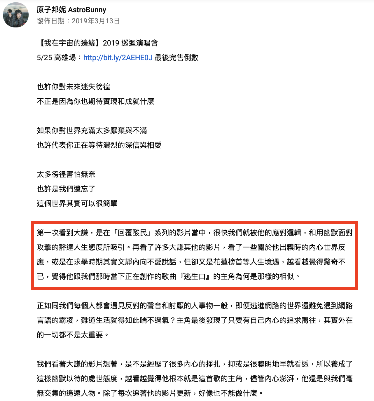 這次黃大謙和樂團「原子邦妮」進行合作,由黃大謙擔任歌曲《逃生口》MV的男主角,而在MV當中他面對著許多酸民的攻擊,而導演也在此影片中埋下許多寓意,像是在MV一開頭時,現實的黃大謙躲在後台不敢面對台下的酸民,在內心對酸民的攻擊有恐懼,當他巧合遇到飛碟後,發現自己擁有了可以用眼神殺死人的超能力,並用此能力消滅所有酸民。然而將所有酸民消滅殆盡後,他才發現沒有酸民,也不會擁有現在的成就。