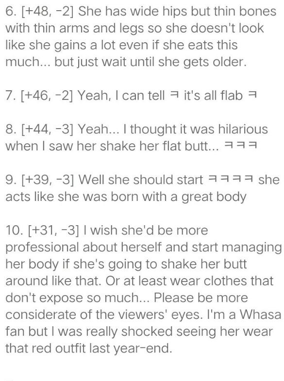 此話一出卻引起韓國論壇「Nate」上的網友兩派歧見,有人支持華莎不忌口卻能擁有姣好身材,但也有酸民無法買單甚至提起去年「MAMA」典禮中,身穿紅色高衩褲的華莎,並評論到「我覺得看到他的屁股在那晃,很嚇人」、「我雖然是華莎的粉絲可是看到那一幕還是嚇到了」、「他好像覺得自己身材很好」。