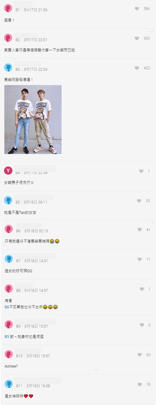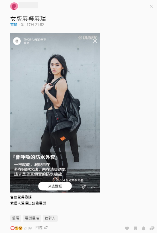 Dcard中,也有許多網友留言表示真的超像,還大開玩笑「其實人家只是帶個假髮代言一下女裝而已啦」,不過便有眼尖的網友看出,這個女生其實有頗有知名度,正是網紅「Ashlee咻咻」!事實上咻咻是同為健身網紅「Tao」的女友,過去Tao和館長發生隔空交火事件,咻咻還曾經拍片回應!