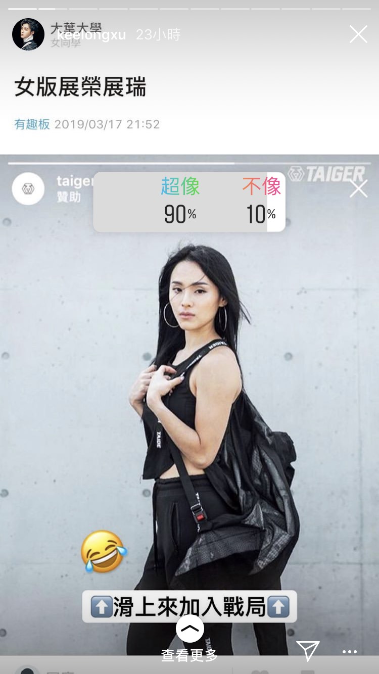 近日有網友在Dcard發文,標題便打上「女版展榮展瑞」,仔細一看,這個女生的五官確實與展榮展瑞有幾分神似,原PO也表示覺得這個女生比較像展榮!文章發布後,立刻引起網友高度討論,展榮本人還特別再限時動態中開啟二選一投票詢問大家像不像,投票結果出爐更有高達90%粉絲認證!