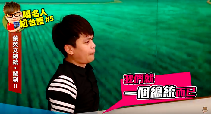 影片到了中間,也進行到台語挑戰時間,當蔡阿嘎詢問準備好接受挑戰了嗎?蔡英文二度結巴,比主持人還緊張,第一個環節「我最會講台語」要在三分鐘內,不要說到謎題本身,讓蔡阿嘎猜對謎題,其中不乏與外交相關的台語題目,最後總統在時間內答對七題,但因為這遊戲是答對遊戲有一題有一秒宣傳時間,節目再加碼,進行到第二關「三十秒快問答」,其中題目阿嘎再度自肥,要蔡英文念出「蔡阿嘎很帥」的台語,二伯表示都聽不下去了。