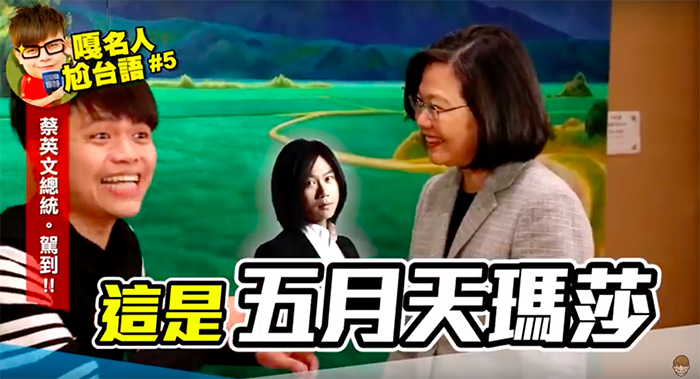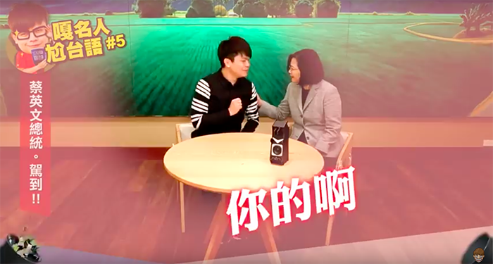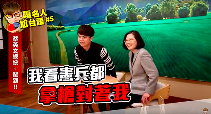 這次蔡英文一共與蔡阿嘎合作兩支影片,其中之一「嘎名人尬台語」是蔡阿嘎影片的經典系列,影片開頭,蔡阿嘎搞笑說來的都要嗆,還說總統來面前,來一個罵一個,被吐槽「我們就一個總統而已」,沒想到小英總統馬上入場,蔡阿嘎嚇到脫口而出這是五月天瑪莎,剛好的是,五月天瑪莎本名蔡昇晏也姓蔡,蔡阿嘎後來馬上改口蔡英文為蔡家之光,還不敢坐得太近,害怕地說:「我看憲兵都拿槍盯著我」。