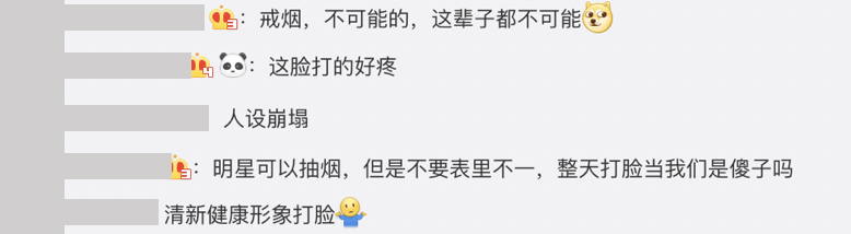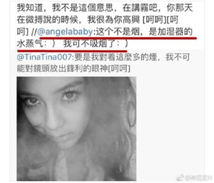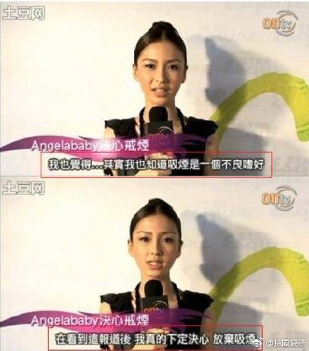 過去粉絲們都知道Angelababy會抽菸,但她在10年前就曾公開說她要戒掉,但卻被捕捉到在醫院外頭抽菸,許多粉絲傻眼的留言寫下:「戒菸,不可能的,這輩子都不可能」、「這臉打的好疼」,許多粉絲也跳出來幫她說話:「抽菸也沒怎麼吧,只要不影響別人就好了呀」、「都已經是成年人了 沒什麼吧!」、「又沒違法」,引起正反兩極的評論。