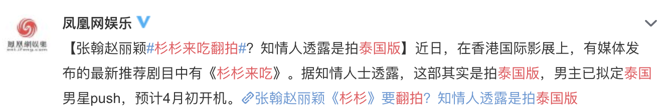 而近日舉辦的香港國際影展上,芒果娛樂發佈最新的推薦會上出現了《杉杉來吃》令人為之一亮。根據知情人士透露,新版將被泰國翻拍,主角為有著全民老公之稱泰國明星Push,預計四月初開拍。